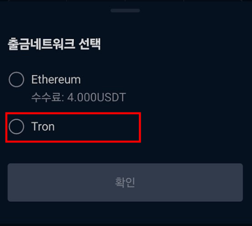 그러면 네트워크를 선택하라고 나오는데 테더의 네트워크는 Tron(TRC20)이 가장 빠르고 저렴합니다.