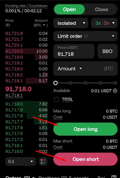 선물거래의 경우 앞으로 가격이 오를것 같다면 Open long 버튼을, 가격이 하락할것 같다면 Open short 버튼을 클릭해 주문을 하시면 됩니다.